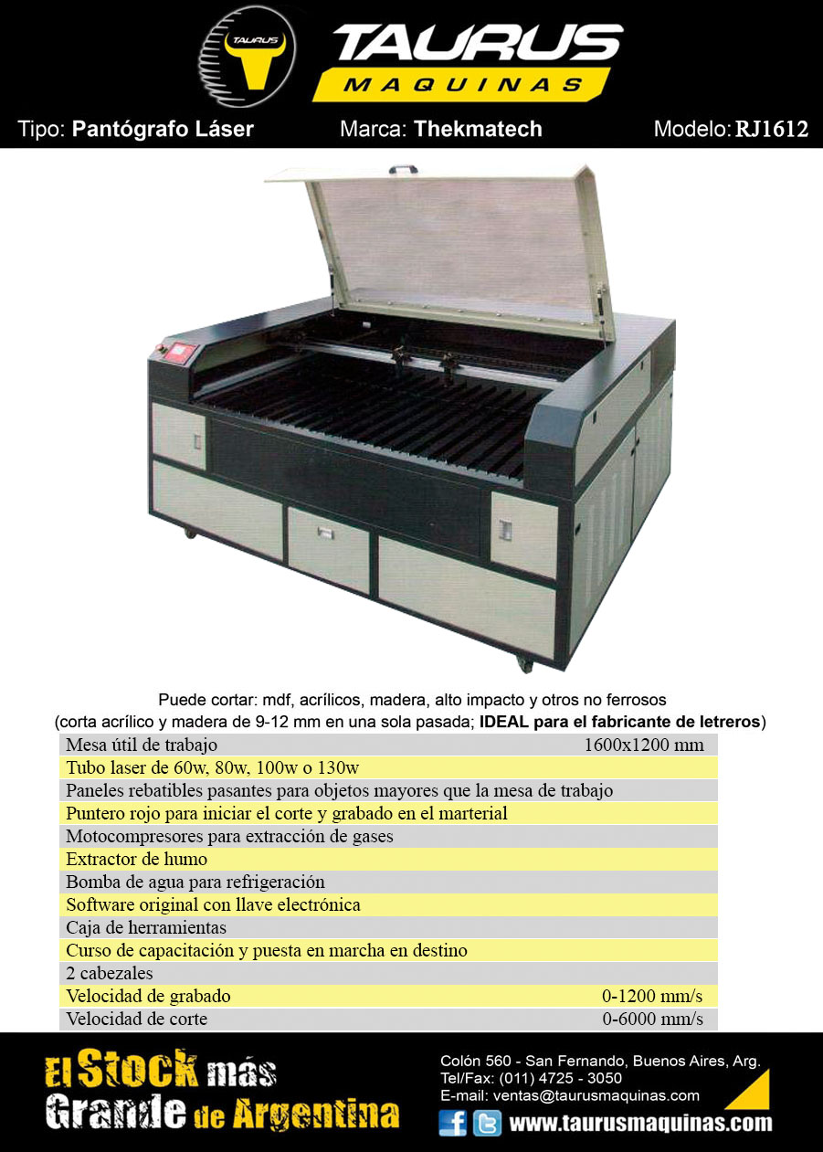 PANTOGRAFO LASER RJ1612 CON DOS CABEZALES. Bomba de agua. Software original con llave electrónica. Ideal para cortar: mdf, acrílicos, madera, alto impacto y otros no ferrosos. Marca: THEKMATECH