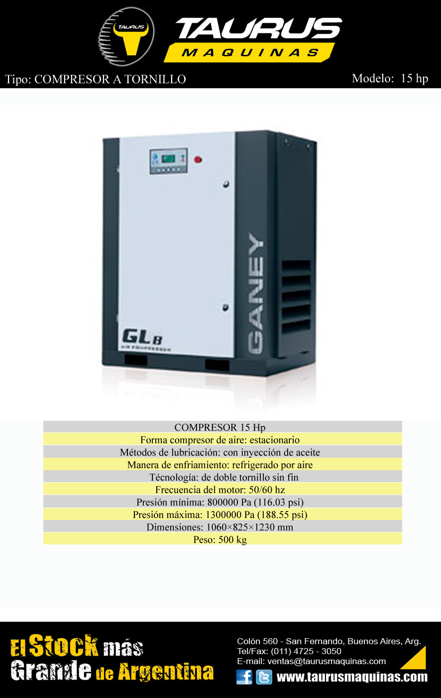 COMPRESOR DE AIRE A DOBLE TORNILLO GLB-11/8 15 hp. Marca: GANEY