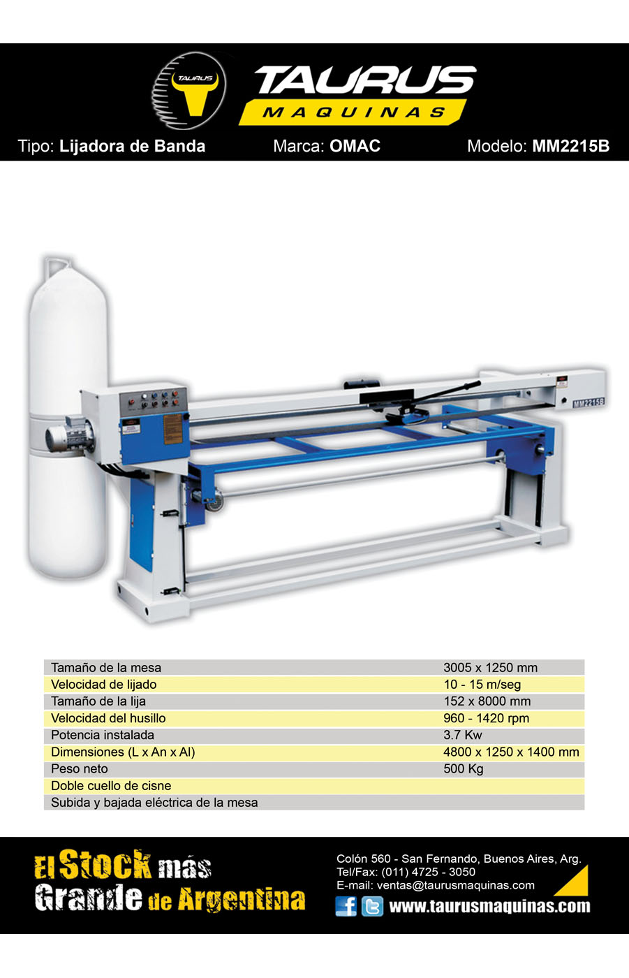LIJADORA DE BANDA MODELO MM2215B. Con subida y bajada eléctrica. Marca: OMAC