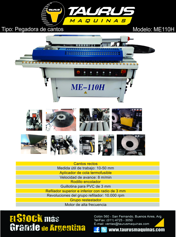 PEGADORA DE CANTOS ME110H. Dimensiones reducidas, precisión, versatilidad y rápidez en puesta a punto en los cambios de espesores de panel y del canto. Grupo encolador, restestador independiente, refilador y pulidor. Motor de alta frecuencia. Marca: OMAC