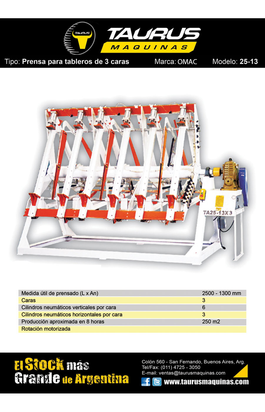 PRENSA DE TABLEROS EN FRIO DE 3 CARAS. Con rotación motorizada. Marca: Taurus
